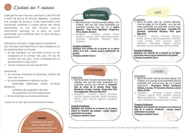 Le baume hydratant a été formulé à partir de beurre et d’huiles végétales ; auxquels une synergie de plusieurs huiles essentielles a été incorporée, conférant à chaque baume, des vertus particulières, en lien, bien souvent, avec la saisonnalité. Appliquer sur la peau, les huiles essentielles vont se diffuser dans le corps de façon diluée et lente.